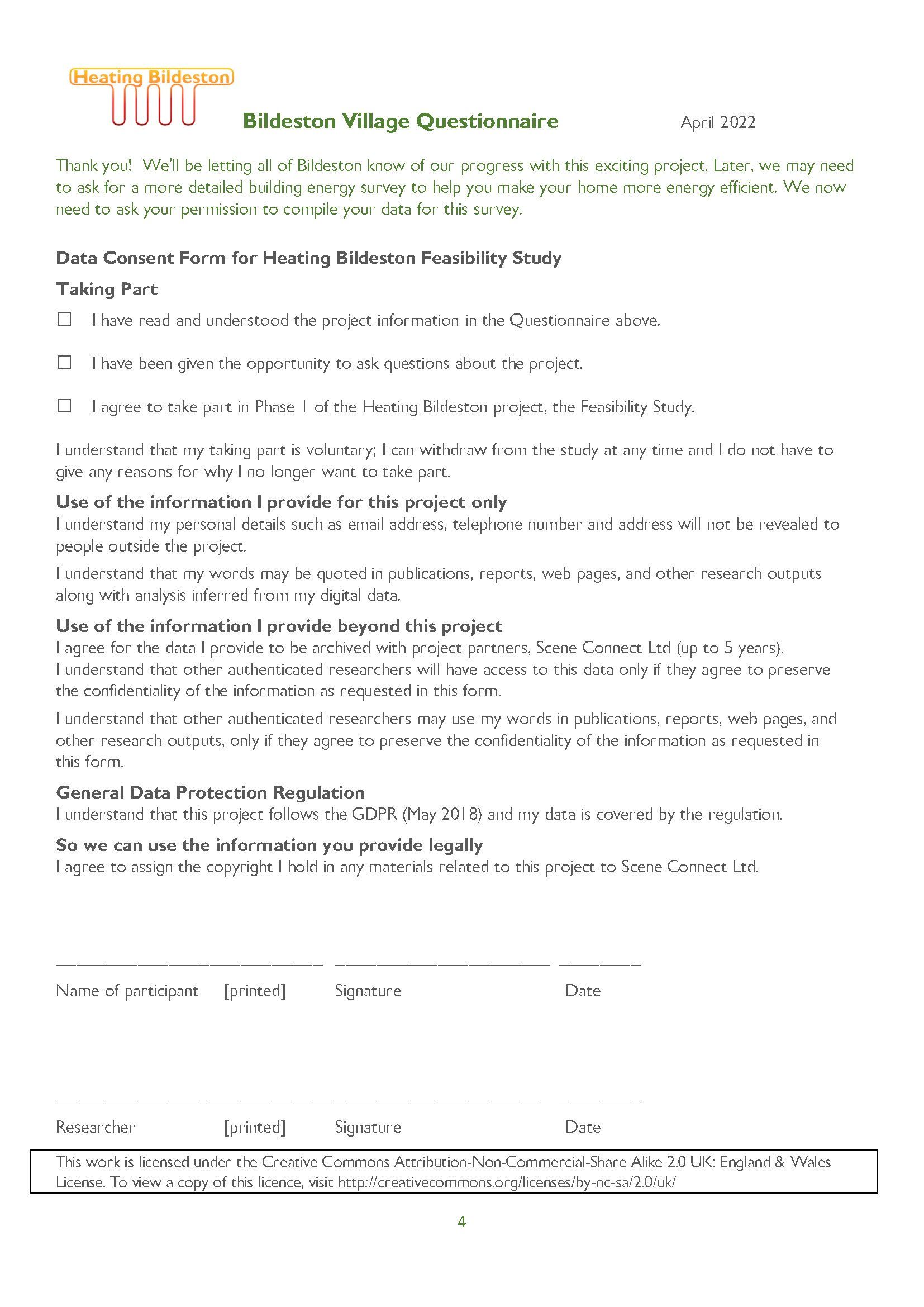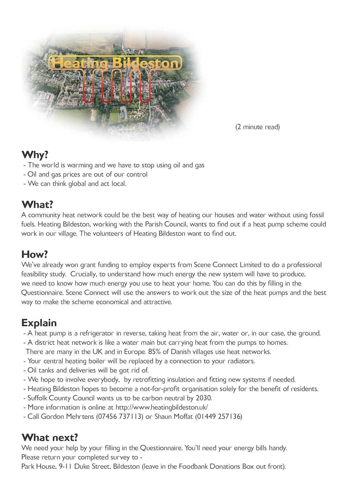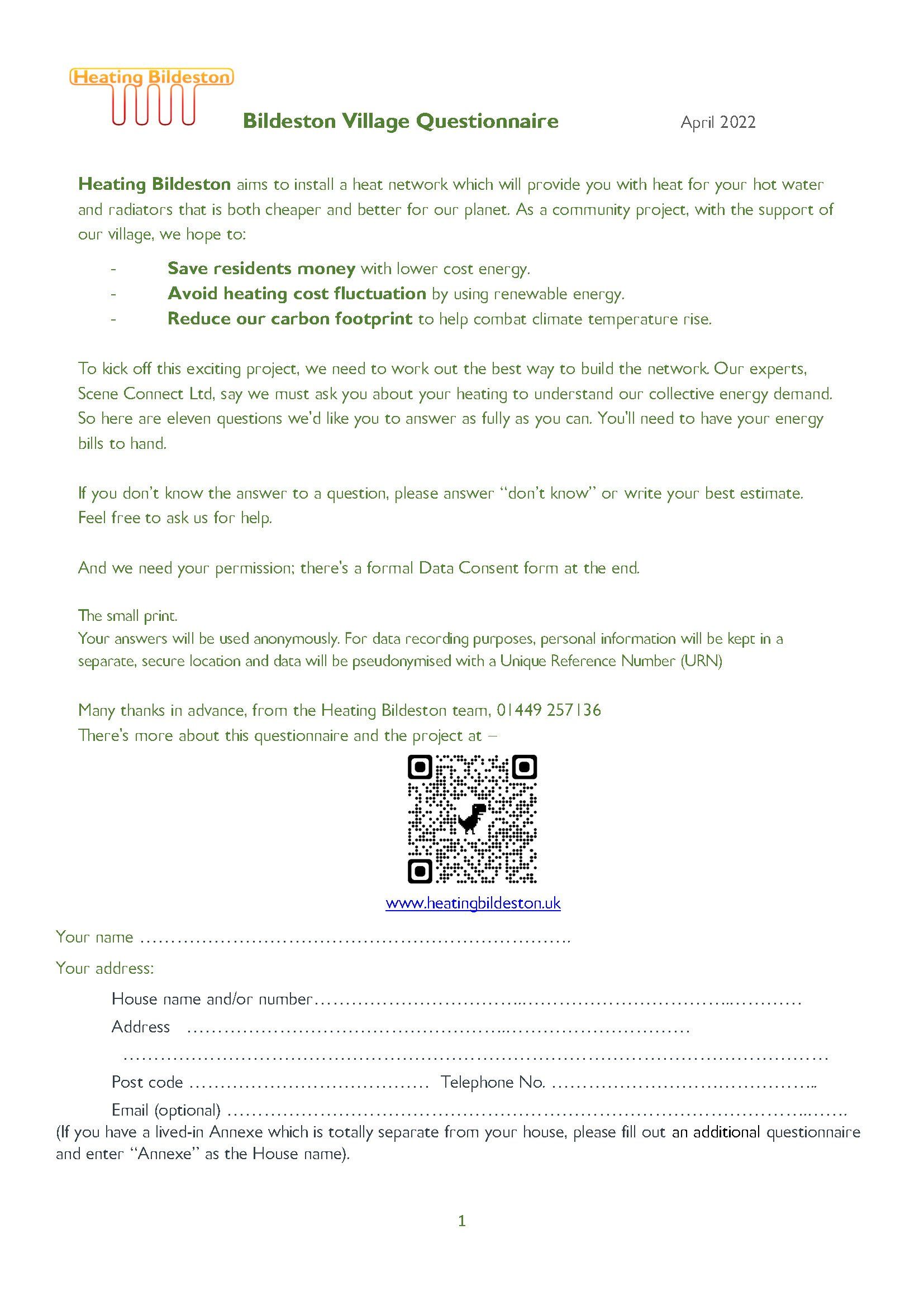 To start this project, we need to work out the best way to build the network. Our experts, Scene Connect Ltd, say we must ask you about your heating to understand our collective energy demand. So coming through your door is a questionnaire with 11 questions we'd like you to answer as fully as you can. You'll need to have your energy bills, for fuel and electricity, readily to hand.